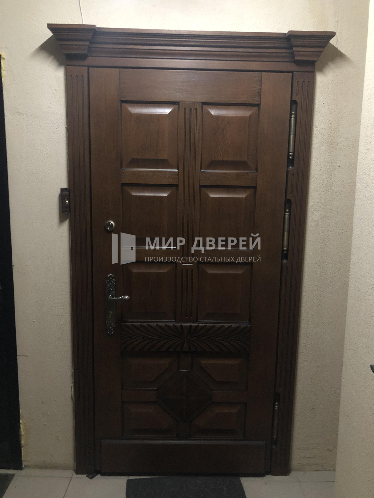 Эта дверь предлагает возможность кастомизации благодаря разнообразным вариантам отделки и добавлению таких элементов, как зеркало, стеклопакеты или кованые детали. Также предусмотрена установка видеодомофона для дополнительного удобства и безопасности, делая её идеальным выбором для тех, кто ценит качество, надежность и стиль.