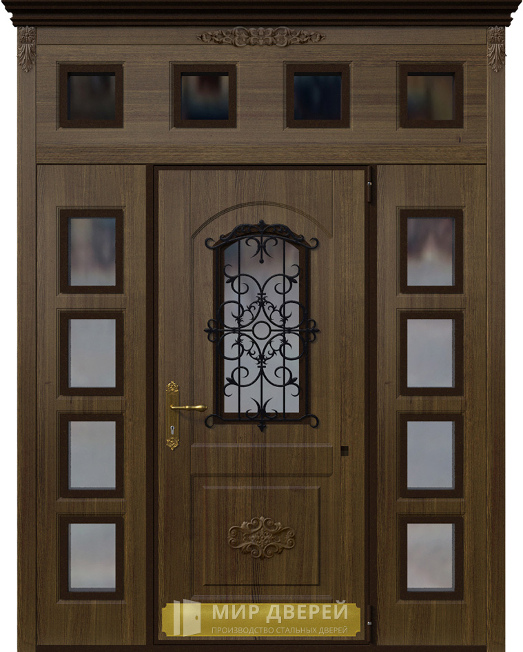 Усиленная парадная дверь с окном и решёткой под корабельную фанеру №2 сочетает в себе функциональность и эстетику, представляя идеальное решение для тех, кто ценит безопасность и стиль. Она изготовлена с использованием панелей МДФ ПВХ, что гарантирует её долговечность и устойчивость к внешним воздействиям. Декоративные элементы в виде ковки и стеклопакета добавляют уникальности и изысканности.